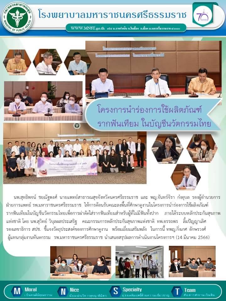 โครงการนำร่องการใช้ผลิตภัณฑ์รากฟันเทียม ในบัญชีนวัตกรรมไทย นพ.สุทธิพจน์ ชยณัฐพงศ์ นายแพทย์สาธารณสุขจังหวัดนครศรีธรรมราช และ พญ.จันทร์จิรา ก๋งอุบล รองผู้อำนวยการฝ่ายการแพทย์ รพ.มหาราชนครศรีธรรมราชให้การต้อนรับคณะลงพื้นที่ศึกษาดูงานในโครงการนำร่องการใช้ผลิตภัณฑ์รากฟันเทียมในบัญชีนวัตกรรมไทยเพื่อการผ่า ตัดใส่รากฟันเทียมสำหรับผู้ที่ไม่มีฟันทั้งปาก ภายใต้ระบบหลักประกันสุขภาพแห่งชาติ โดย นพ.สุวิทย์ วิบุลผลประเสริฐ คณะกรรมการหลักประกันสุขภาพแห่งชาติ ทพ.อรรถพร ลิ้มปัญญาเลิศ รองเลขาธิการ สปช. (14 มีนาคม 2566) แหล่งข่าวจากหน่วยงาน : รพ.มหาราชนครศรีธรรมราช Maharaj Nakhon Si Thammarat Hospital วันที่ประกาศข่าว : 18 มีนาคม 2566 ย้อนกลับ